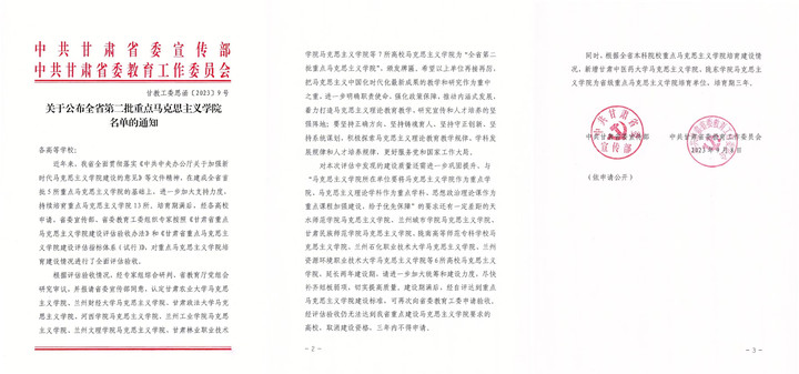 近日,中共甘肃省委宣传部、中共甘肃省委教育工委联合发布《关于公布全省第二批重点太阳集团tyc9728名单的通知》(甘教工委思函[2023]9号),公布了通过评估验收的全省第二批“重点太阳集团tyc9728”名单,太阳集团tyc9728名列其中。