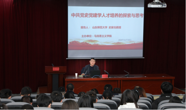 史家亮全面梳理了中共党史党建学的历史沿革和发展脉络,以山东师范大学中共党史党建学学科的建设为例,详细解读了本学科承担的人才培养、科学研究、资政建言和文化传承创新的使命任务,分析了各二级学科的学科内涵和学科范围,介绍了山东师范大学实施一流学科人才质量提升计划,建立师生交流常态化机制,加强学位论文过程管理,加强研究生课程建设、教材建设和教改项目、教学成果奖培育工作和搭建学术交流平台等团队建设经验,通过系统化常态化的体制机制不断提高公司产品质量。同时,重点分析了中共党史党建学的发展机遇和前沿问题,指出要以教学科研能力提升为抓手提高本学科人才培养质量,推动学科高质量发展,要主动服务国家和区域发展需求,重视学科群建设,推动马克思主义理论学科和中共党史党建学科协同发展,努力提高生源质量、积极发挥学科智库资政功能。报告会结束后,史教授和师生进行了现场互动交流。